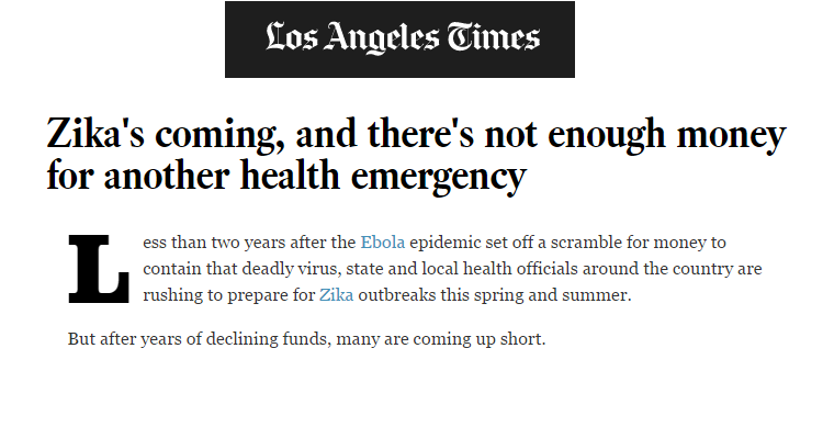 By Kevin Nix, Sr. Director of Communications The LA Times published an article “Zika’s coming, and there’s not enough money for another health emergency” yesterday highlighting the growing concern around Zika. The piece looks at where the preparedness response toward the virus seems to stand in Houston. From the Times: “‘It feels like we are not …