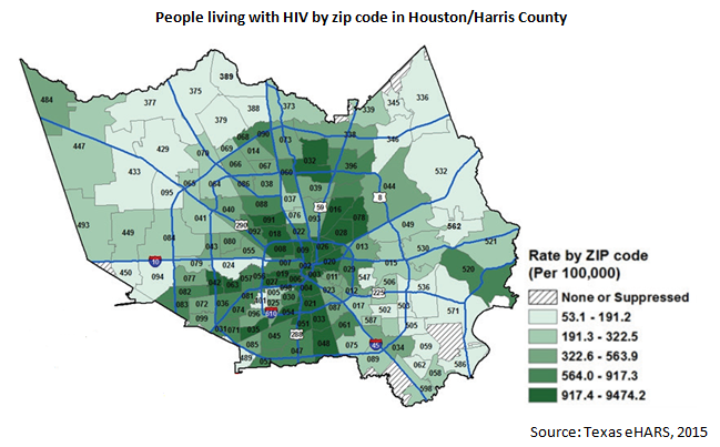 One out of every 200 persons in Houston reports living with HIV, according to the Houston Health Department. The disease has reached epidemic levels in Houston, hitting certain zip codes hard. The zip codes with the highest rates of HIV include 77053, 77047, 77045, 77048, 77051, 77033, 77035, 77054, 77061, 77021, 77030, 77004, 77006, 77003, 77027, 77098, 77520, 77020, 77002, 77007, 77009, 77008, 77026, 77028, 77078, 77016, 77022, 77018, 77091, 77088, 77092, 77060, 77032, 77090, 77068, 77056, 77057, 77063, 77042, 77063, 77036, 77081, 77074, 77031, 77071, 77082 and 77083.