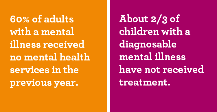 Mental illness is quite common: One in five adults in America experience a mental illness, and nearly one in 25, or more than 10 million American adults, live with a serious mental illness. Thankfully, much progress has been made in decreasing stigma in recent years; many who previously were not willing to seek help for their struggles now are. However, many are still not getting treatment. 60% of adults with a mental illness received no mental health services in the previous year, and the average delay between onset of mental health symptoms and intervention is 8-10 years. Studies in recent years from the National Institute of Mental Health and the Child Mind Institute have shown similar numbers for children – about 2/3 with a diagnosable mental illness have not received treatment.